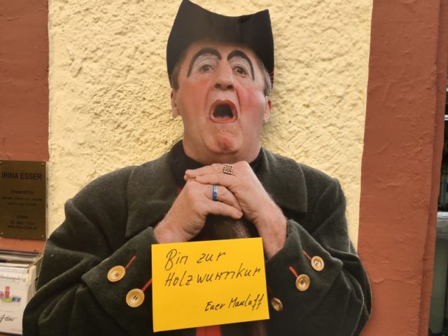 Die Tafel des Maulaffs war diesmal durch einen gelben Zettel ersetzt. Und der Maulaff selber wurde durch einen täuschend echten, da unbeweglichen, lebensgroßen Pappkameraden vertreten. Nun, auch der Maulaff darf in den Sommerferien einmal urlauben oder sich, wenn man dem Pappschild Glauben schenken darf, einer wohltuenden (Holz-)Wurmkur unterziehen…