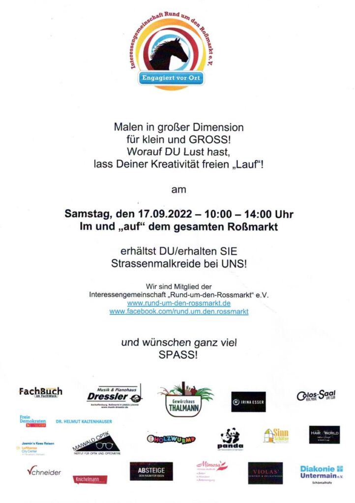 Der Bodenbelag im gesamten Roßmarkt – von Musik- und Pianohaus Dressler bis zur Sandkirche – wird durch Eure und Ihre Kreativität in ein Strassenkunstwerk verwandelt