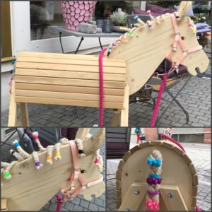 Da sich bekanntermassen ja vor allem Mädchen für Pferde und deren Pflege begeistern, hat es sich Trixi Maiwald nicht nehmen lassen, das hauseigene Pferd mit besonders schönen und vielen Zöpfen und Schleifen „artgerecht“ in Szene zu setzen. Ab sofort lädt Susi, so der Name des neues Holzpferdes,  vor dem Ladenlokal von Optik Maiwald zum Probereiten und Posieren ein.