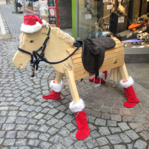 Auch ein „Ross“ (vor dem Spielwarengeschäft „Holzwurm“) hat sich schon ganz weihnachtlich eingestimmt.