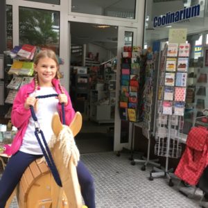 Die Rösser im Roßmarkt erfreuen sich großer Beliebtheit – besonders bei den kleineren Kindern! (hier vor dem Geschäft „Heilands“, dem ökomenischen Kirchenladen). Aber auch die Eltern und alle Passanten haben Ihren Spaß beim Vorbeigehen.
