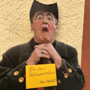 Die Tafel des Maulaffs war diesmal durch einen gelben Zettel ersetzt. Und der Maulaff selber wurde durch einen täuschend echten, da unbeweglichen, lebensgroßen Pappkameraden vertreten. Nun, auch der Maulaff darf in den Sommerferien einmal urlauben oder sich, wenn man dem Pappschild Glauben schenken darf, einer wohltuenden (Holz-)Wurmkur unterziehen… -