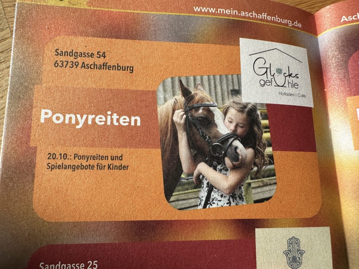 Glücksgefühle – Sandgasse 54 bietet unseren kleinen Besuchern ein buntes Programm: Ponnyreiten – Reitschule Reinhart/Niedernberg 12-15 Uhr und Spiele